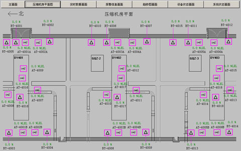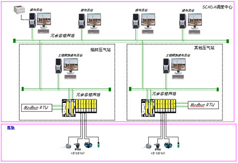 西氣東輸陜京2線增輸工程榆林壓氣站、陽曲壓氣站、石家莊壓氣站和興縣壓氣站要求每個壓氣站配備一套SIL2等級的冗余配置的火氣控制系統(tǒng),每個系統(tǒng)有一個工程師站兼操作員站以及SIL2控制系統(tǒng)構(gòu)成,對壓縮機廠房內(nèi)可能的氣體泄漏和火焰進行檢測并報警。通過安裝于現(xiàn)場危險區(qū)域的氣體及火焰探測器探測現(xiàn)場險情,當發(fā)生氣體泄漏或火災(zāi)時,火災(zāi)和氣體控制系統(tǒng)進行報警,提醒操作人員采取相應(yīng)措施。同時將報警信號通過硬接線和通信方式傳輸給站控系統(tǒng)PLC和ESD系統(tǒng)�;馂�(zāi)和氣體控制系統(tǒng)將與站控系統(tǒng)PLC采用RS485串行通信方式,通訊協(xié)議為MODBUS-RTU協(xié)議。每個壓氣站系統(tǒng)結(jié)構(gòu)圖與操作畫面如下: